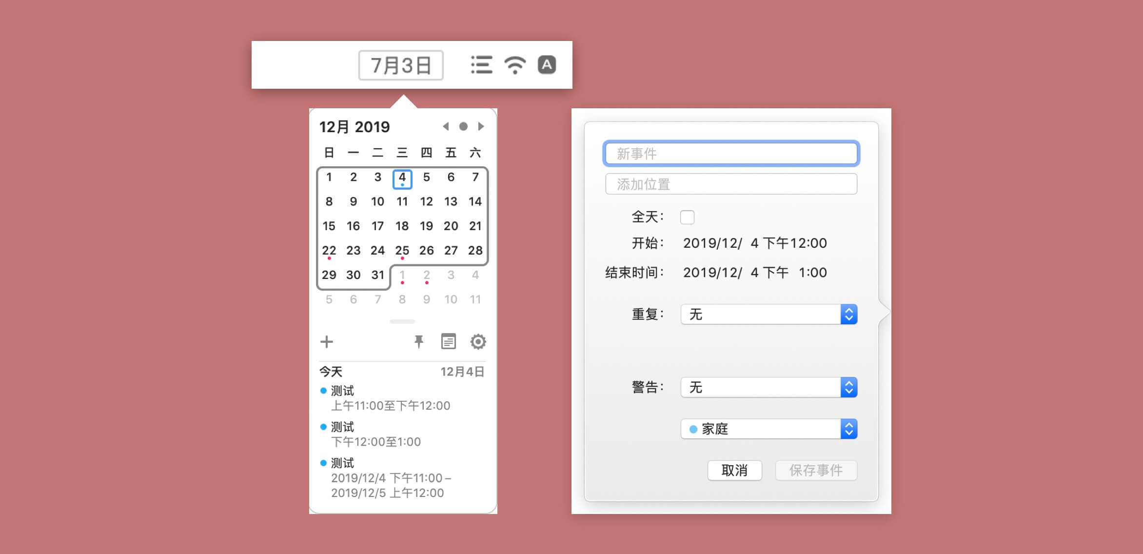 非常简单小巧的菜单栏日历,轻点可以呼出日历表,也可以直接在菜单栏上显示时间。还可随手在日历上记录一些提醒事项、家人生日。